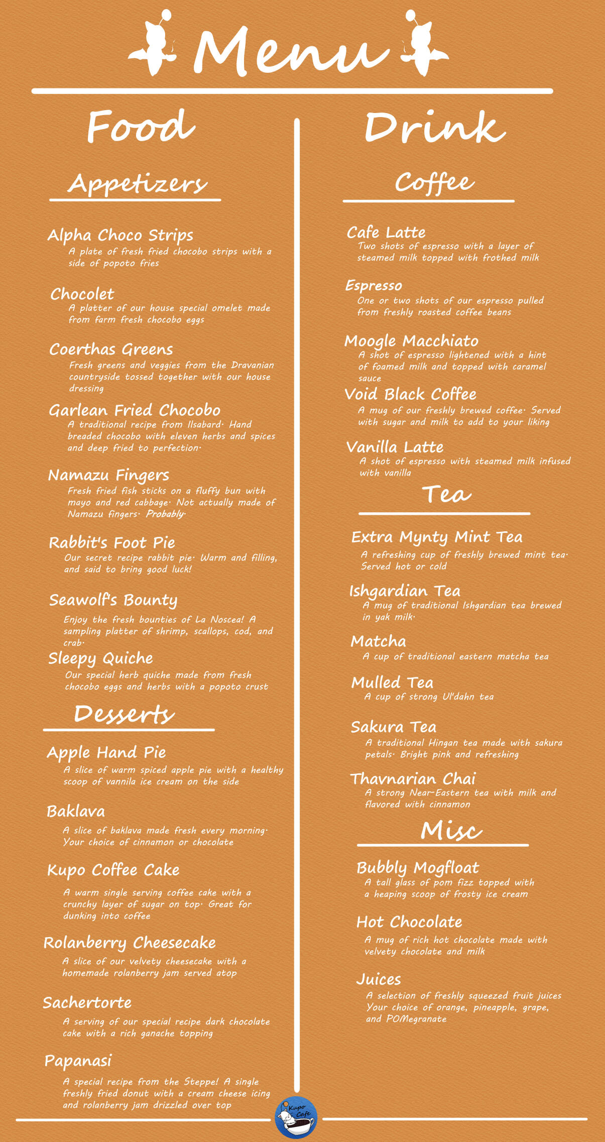 1: Check weapons at the door.2: This is a SFW venue, so keep it family friendly.3: No discrimination of any kind. Just be respectful and considerate of others.4: No fighting please. This is a cafe, not a bar.4: If a staff member asks you to knock it off, then do so.
